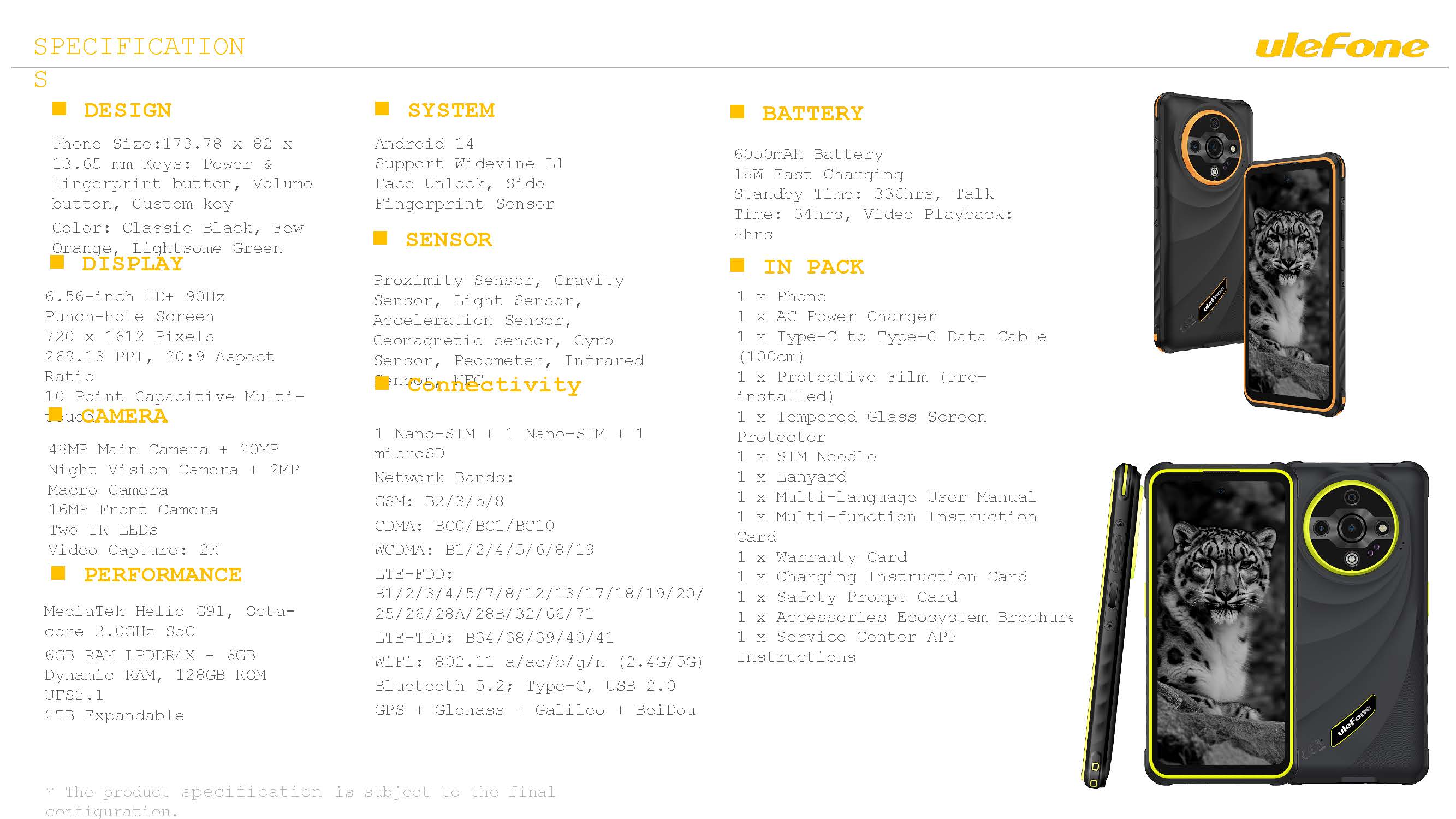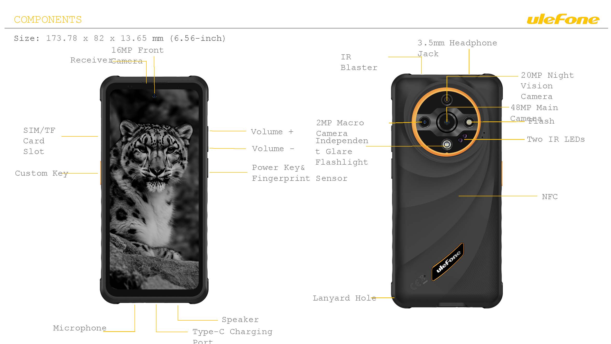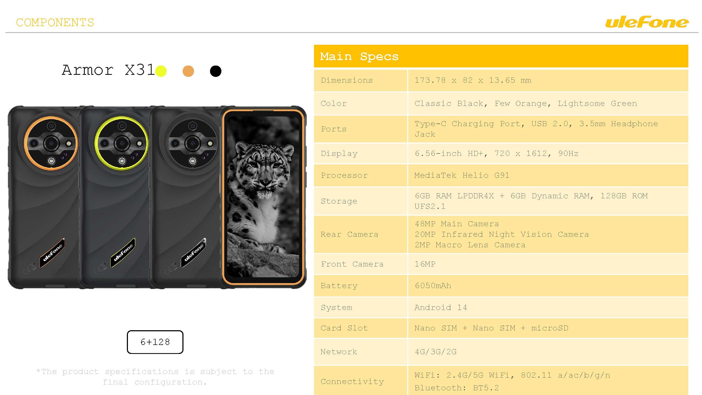 Description Ulefone Armor X31 • Rugged Smartphone• 6.56" HD+ Display• 12GB RAM + 128GB Storage• 48MP Night-Vision Camera• 20MP Infrared Camera• 6050mAh Battery• IP68 & IP69 Waterproof & Drop-proof• NFC• Unlocked (Dual SIM) BlackExperience ultimate durability and performance with this rugged smartphone, packed with powerful features like a 6.56" HD+ display, 12GB RAM, night vision and infrared cameras, and a long-lasting 6050mAh battery — all housed in a waterproof, drop-proof body built for any adventure.