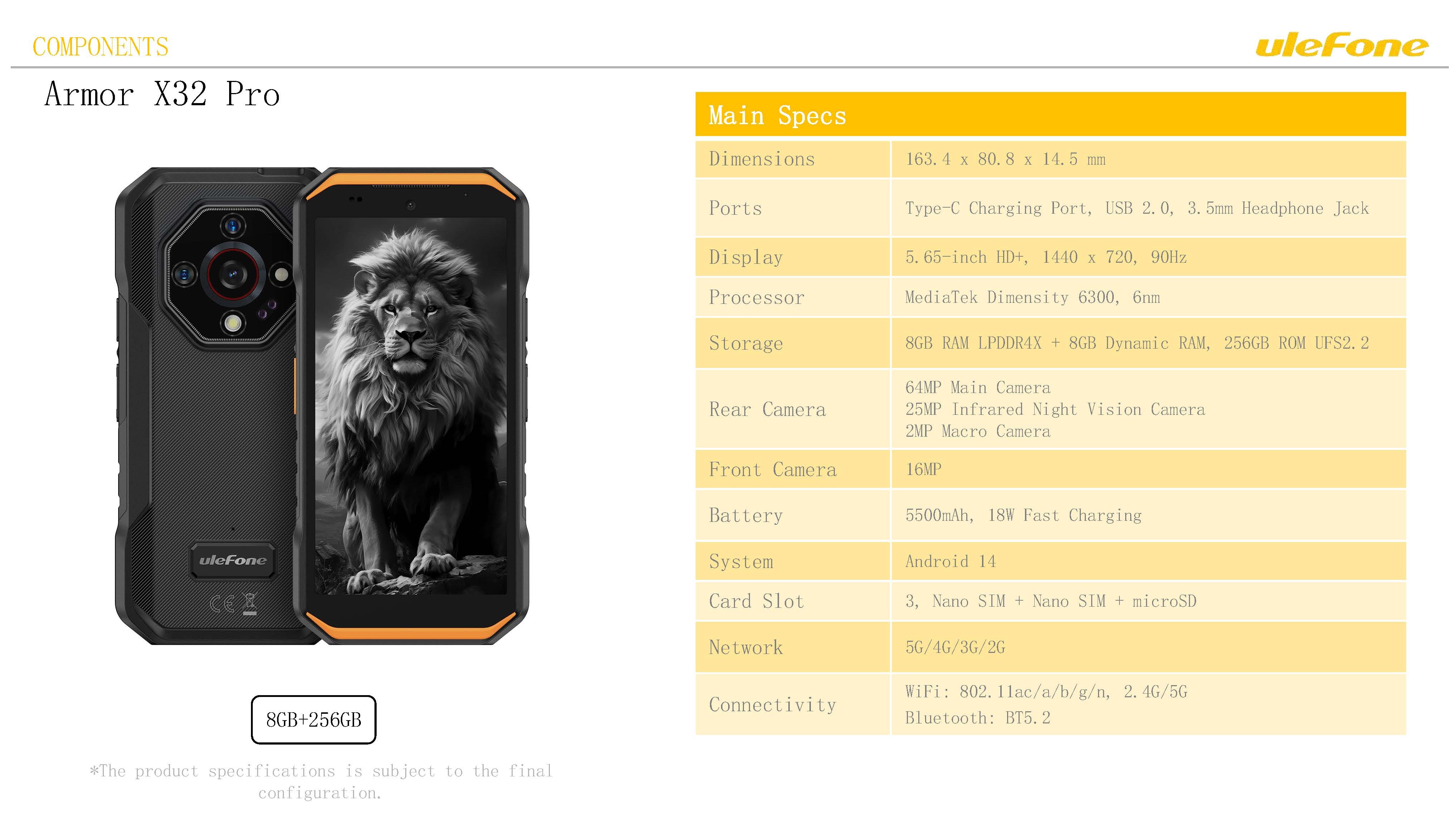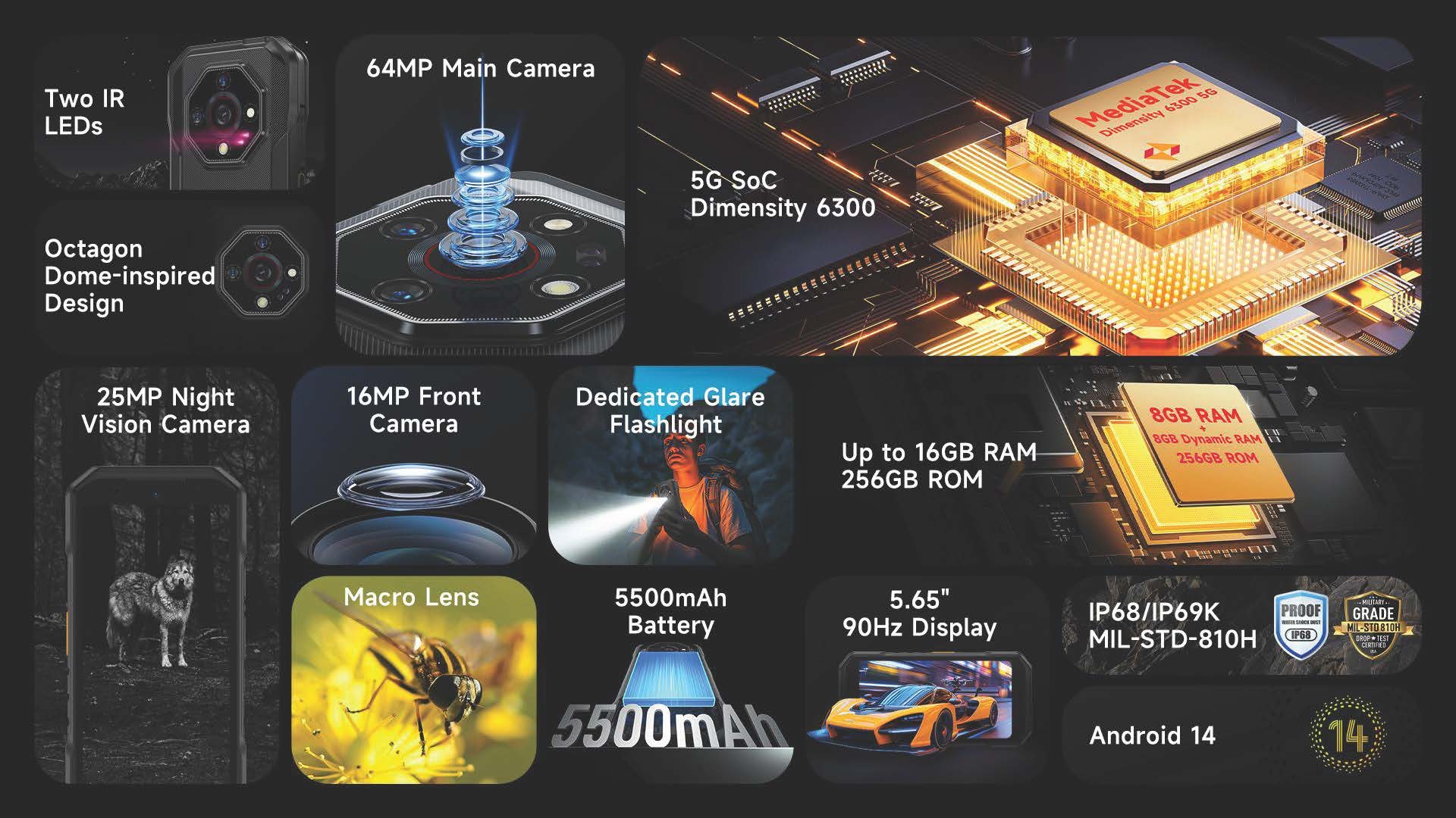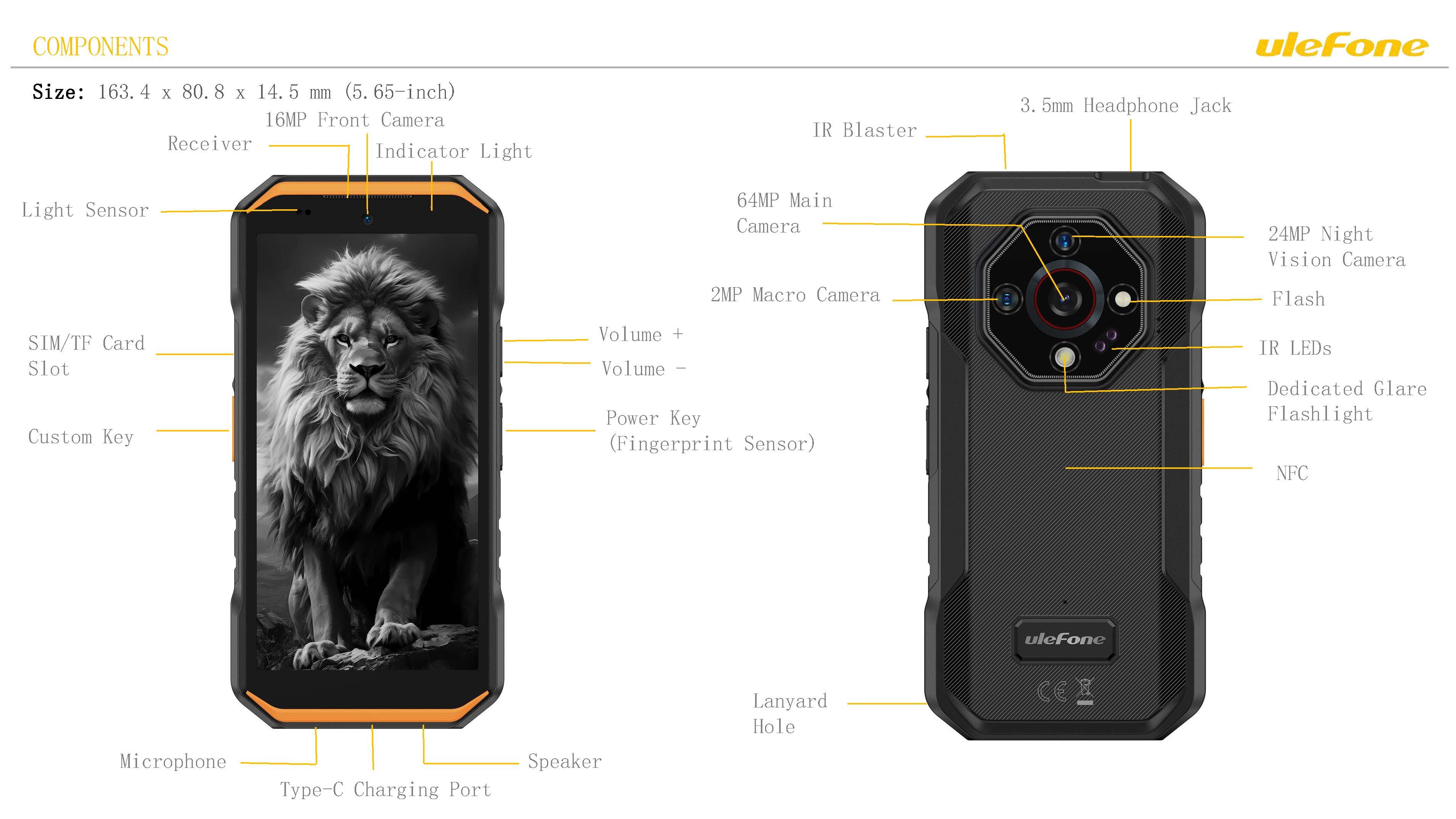 Description Ulefone Armor X32 5G • Rugged Smartphone• 5.65" HD+ Display• 16GB RAM + 256GB Storage• 64MP Wide-Angle Camera• 25MP Infrared Night-Vision Camera• 2MP Macro Camera• 5500mAh Battery• IP68 & IP69 Waterproof & Drop-proof• NFC• Fingerprint Sensor• Dedicated Glare Flashlight• IR Blaster• IR LEDs• Unlocked (Dual SIM) BlackUlefone Armor X32 5G - A rugged smartphone built for extreme durability with a 5.65" HD+ display, 16GB RAM + 256GB storage, 64MP wide-angle camera, 25MP infrared night-vision, 5500mAh battery, IP68/IP69 waterproofing, NFC, fingerprint sensor, IR blaster, glare flashlight, dual SIM, and drop-proof design.